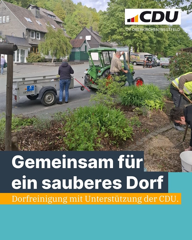 Die CDU Westfeld hat gemeinsam mit dem Dorfverein eine erfolgreiche Dorfreinigung durchgeführt! Dank des Engagements des Dorfvereins und der Unterstützung der CDU vor Ort konnten Westfeld so wieder ein Stück schöner gemacht werdenen. Solche Aktionen stärken den Gemeinschaftssinn und zeigen, wie wichtig es ist, gemeinsam Verantwortung für unsere Heimat zu übernehmen. Ein großes Dankeschön an alle Helferinnen und Helfer – zusammen schaffen wir ein lebenswertes und sauberes Dorf!
